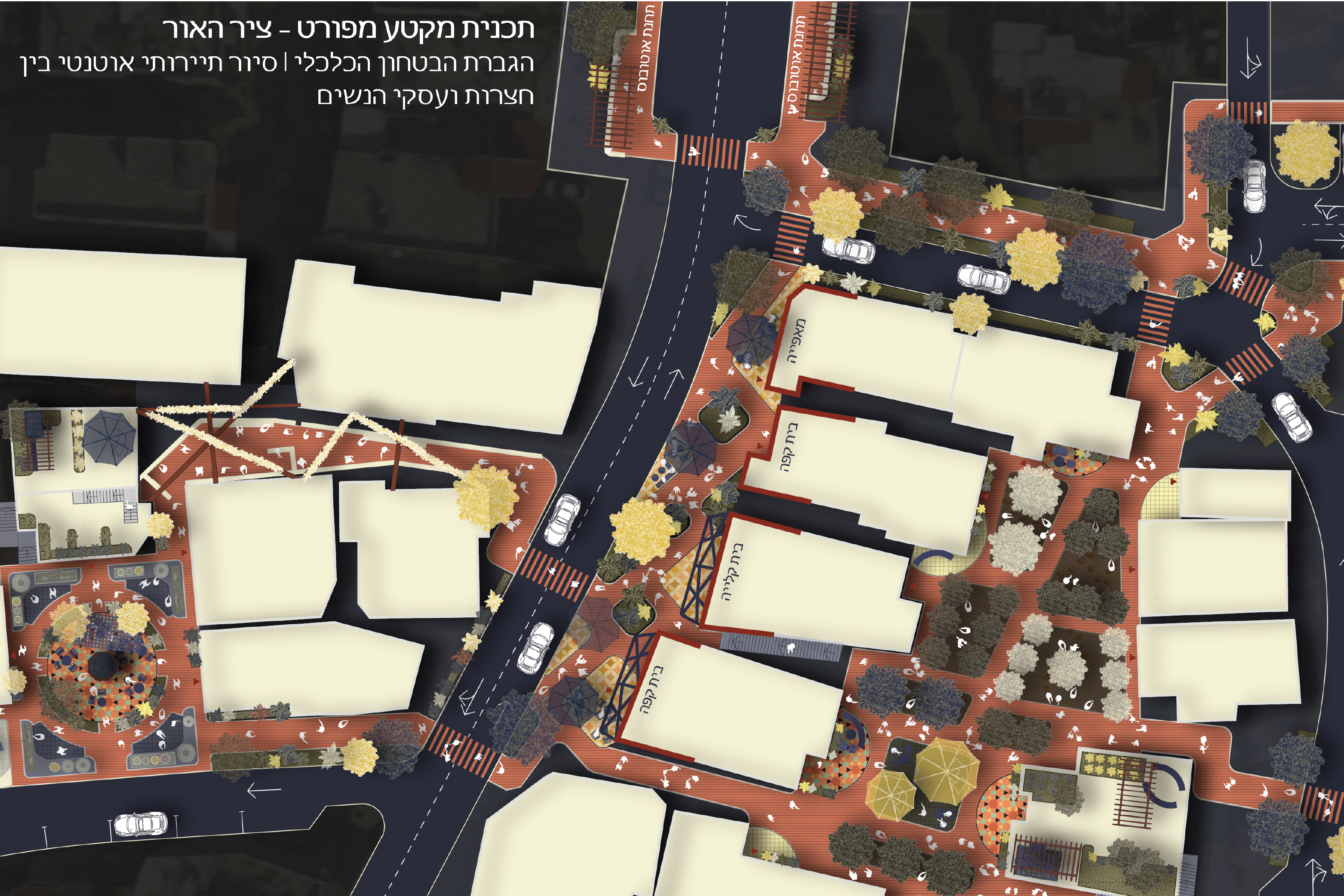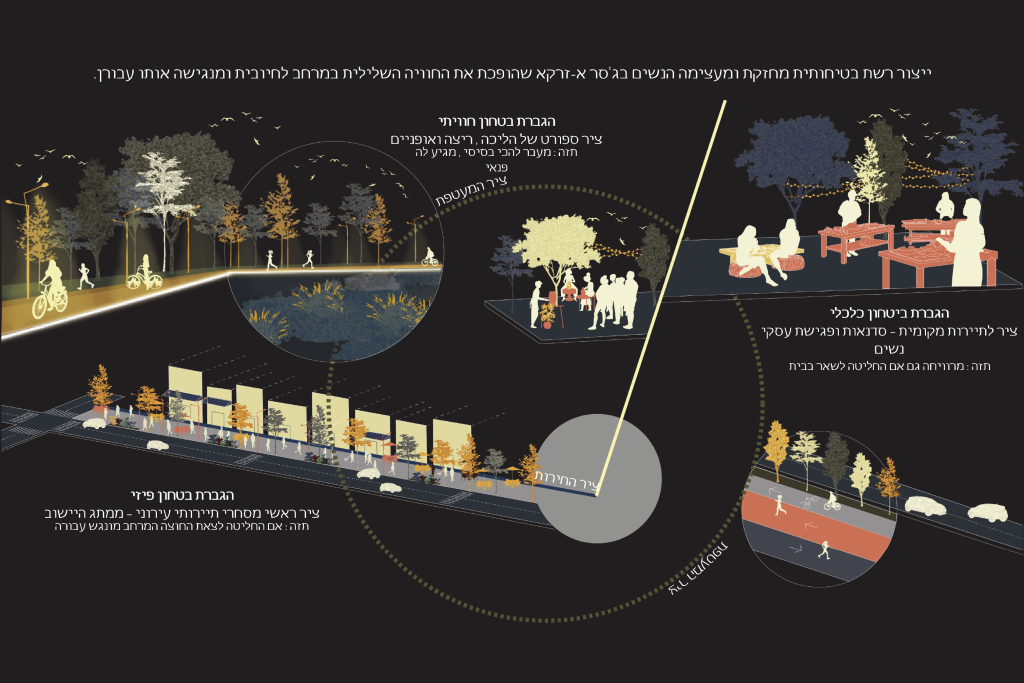 למרות מציאות מאתגרת זו, מיקומו הגיאוגרפי סמוך לחוף הים ולכפר הדייגים היחיד בישראל מציב אותו כבעל פוטנציאל תיירותי משמעותי, שעדיין אינו ממומש , ובגלל שביטחון הוא לא רק היעדר סכנה אלא גם היכולת של קהילה ונשים בפרט לפעול בחופשיות, להשתתף בכלכלה ולחיות במרחב שנבנה עבורן , מטרת הפרויקט היא לייצר רשת ביטחונית חברתית ומרחבית שמחזקת ומעצימה את הנשים בג'סר א-זרקא כמנוף לפיתוח כלכלי, חברתי וקהילתי שמותאם לצרכיהן , ולהפוך הכפר ממוקד דחיקה בשוליים למודל של יציבות חברתית שמקדם שוויון מגדרי, ביטחון ונגישות . דרך ביסוס שלושה סוגי ביטחון: פיזי, כלכלי וחוויתי לאורך שלושה צירי תנועה מרכזיים בכפר , שיקום הגרעין ההיסטורי וטיפוח כפר הדייגים כעוגן ייחודי. ראשית הביטחון הפיזי יתחזק באמצעות שינוי חתך הרחוב ושיפור הקישוריות במרחב .שנית הביטחון הכלכלי יקודם דרך תכנון מסלול תיירותי – תרבותי בסגנון אותנטי שיחצה חצרות וגגות הנשים .ובסוף הבטחון החוויתי יתבטא בתכנון מסלולי הליכה , ריצה ואופניים בפארק שסובב ג'סר .