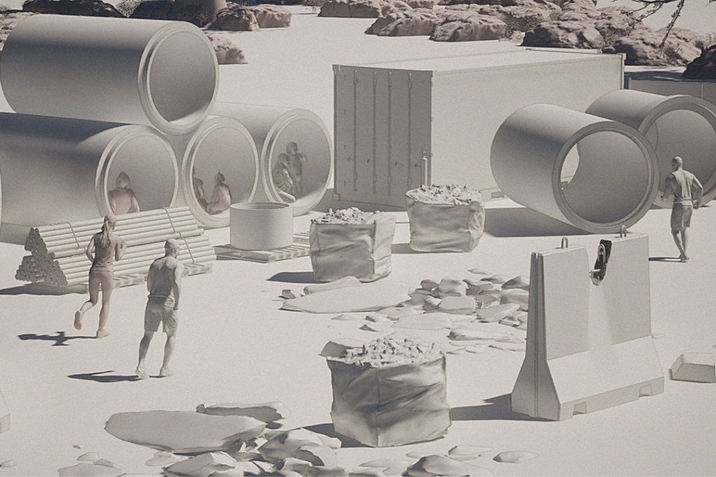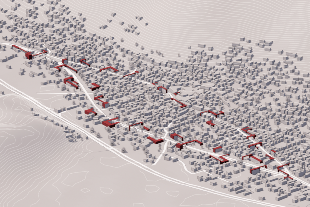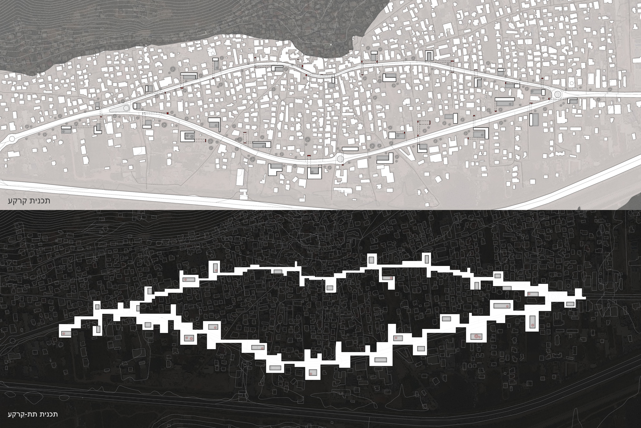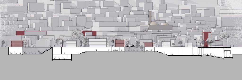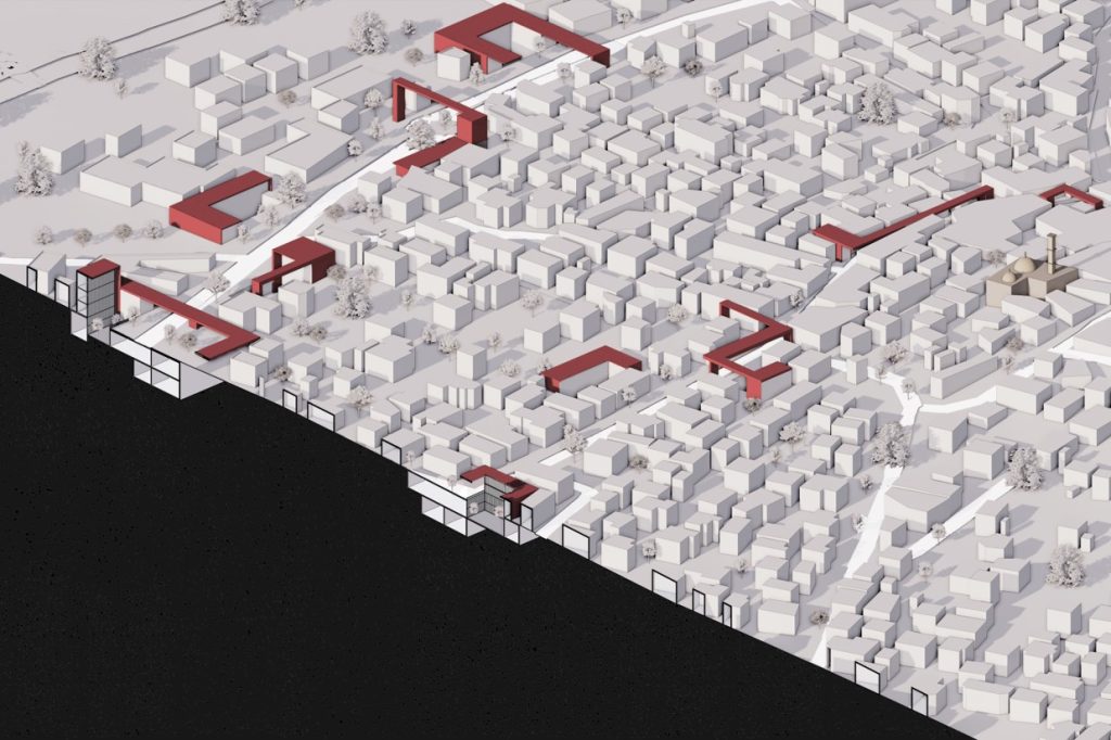 התערבות אדריכלית זו פועלת בשני רבדים משלימים. הרובד העילי, מבנים הממוקמים לאורך צירי התנועה הראשיים, יוצרים קירוי פסיכולוגי ופיזי המגדיר מחדש את דפנות הרחוב כמרחבים מוכלים ומוגנים. במקביל, באמצעות פתחים אסטרטגיים בקרקע המשמשים גם כמעברים פעילים בין שתי דפנות הרחוב, נוצרת גישה לשכבה עירונית חדשה, תת־קרקעית, שהיא שכבה המשלבת בתוכה מיגון ופונקציות ציבוריות: מוסדות קהילתיים וחינוכיים, חללים מסחריים, מרכזי תעסוקה ואף יחידות דיור זמניות.