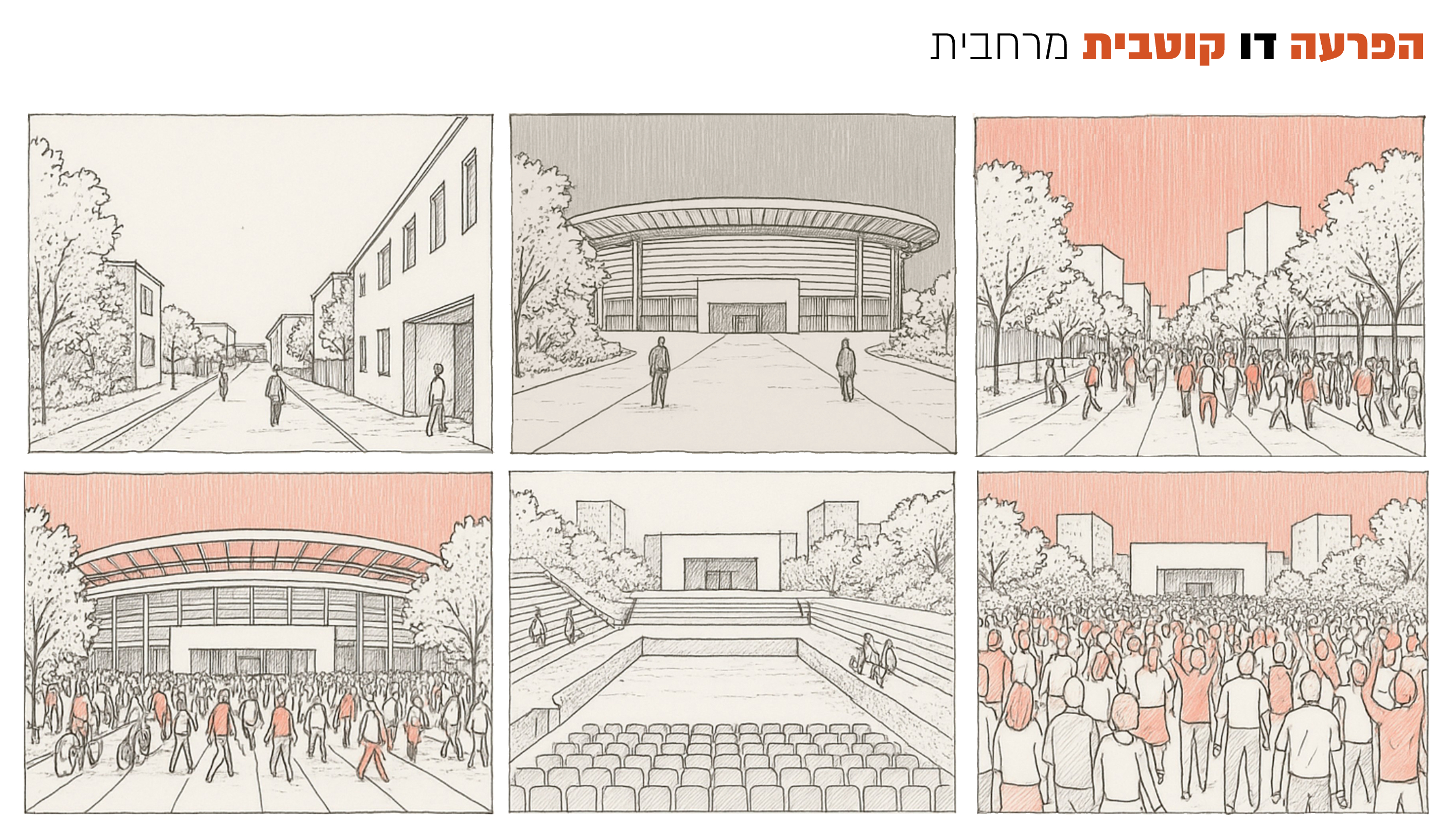הפרויקט עוסק במרחבים דו-קוטביים, מבנים בקנה מידה עצום כמו אצטדיונים, מרכזי כנסים והיכלי מופעים, המתמלאים לפרקי זמן קצרים בעצימות גבוהה ולאחר מכן נותרים ריקים ואטומים בלב העיר. מצב זה יוצר נתק פיזי, חברתי וחווייתי, ומעלה את השאלה כיצד ניתן לתכנן מרחב עירוני שמכיל קוטביות, לא כבעיה אלא ככוח מארגן.