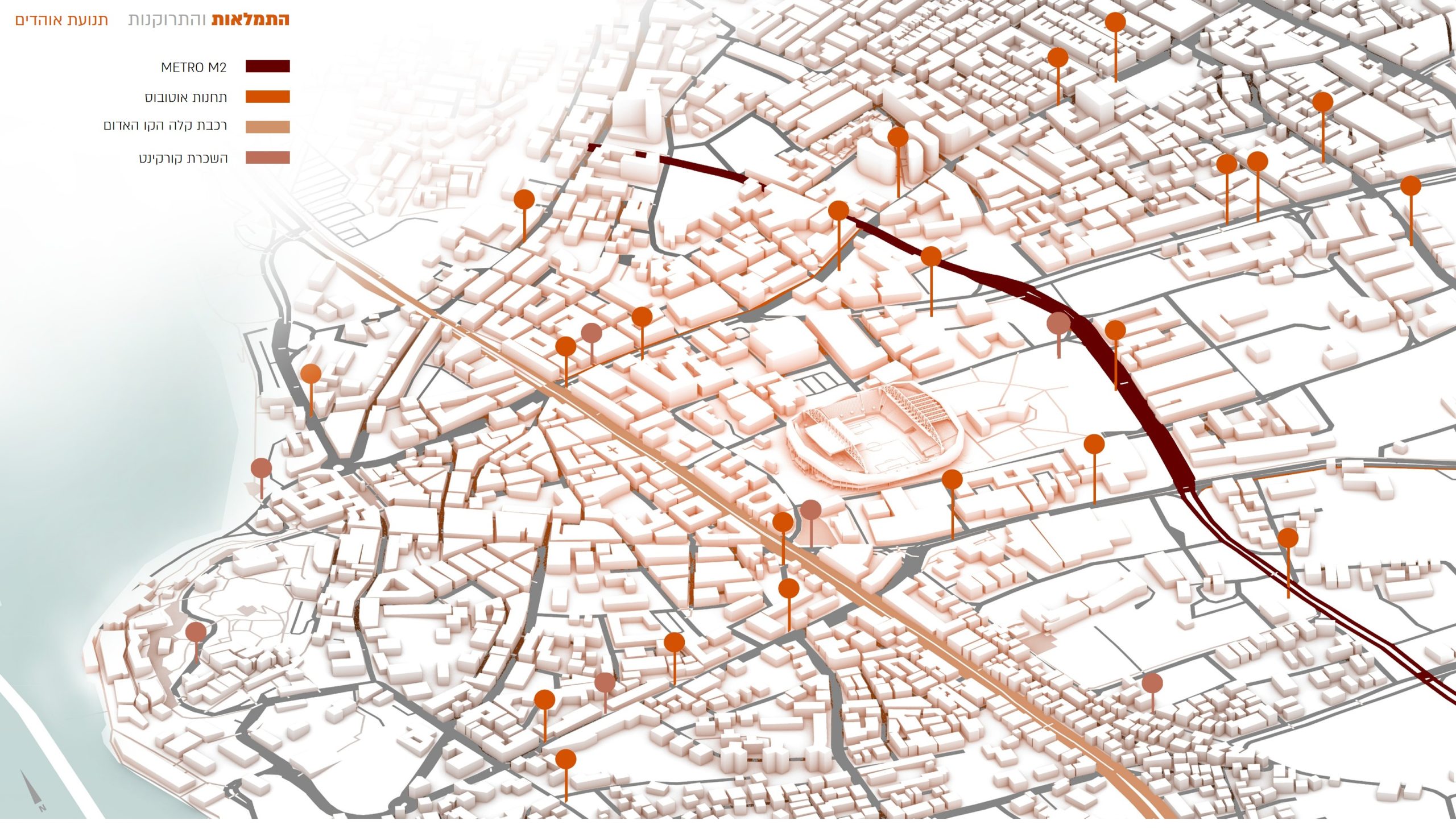 האסטרטגיה המוצעת מייצרת מערכת עירונית מווסתת. האצטדיון נקבר בחלקו ונפרשת מעליו רקמה מתווכת רב שכבתית. תכנון זה משתלב בגריד של שדרות ירושלים ומחזק את הקישוריות בין השדרה לבין האצטדיון, שנוכחותו נשזרת מחדש בחיי היומיום. קפלי קרקע יוצרים רחובות פנימיים, מסחר ומשרדים. בריכות חורף מספקות מענה לבעיות ההצפה ומשמרות את זיכרון המקום כביצה, תוך שהן משמשות בשאר ימות השנה כשטחי ציבור פתוחים. מהלך זה אינו מוחק את הקוטביות אלא ממיר אותה למערכת עירונית סופגת, שבה ריק ומלא אינם משתקים את המרחב והאצטדיון חדל מלהיות גוף מנותק.