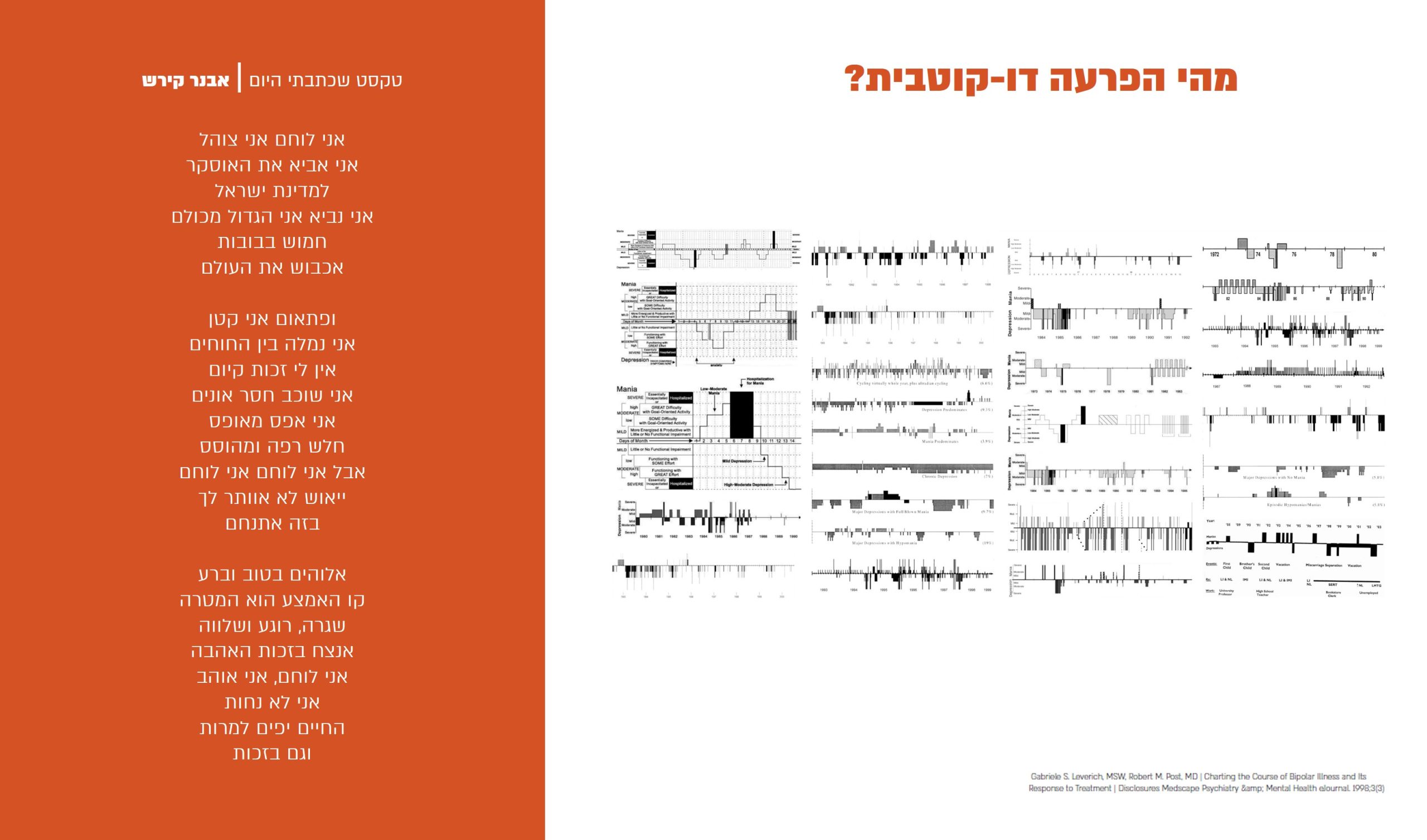 הפרויקט שלי נולד מתוך היכרות עם המורכבות של ההתמודדות עם הפרעה דו-קוטבית. בהתבסס על חוויותיו של דודי המאובחן כחולה במאניה דפרסיה. על הרגעים שבהם היה חד, יצירתי וחסר מנוח, ועל התקופות שבהן נעלם לתוך עצמו, התנתק, כאילו העולם סביבו איבד את צבעיו. האם אפשר לאפיין מרחב שמשקף את התנועה הבלתי פוסקת בין גאות ושפל, בין התמלאות להתרוקנות? פריזמה נפשית כהשראה למסגרת תכנונית.