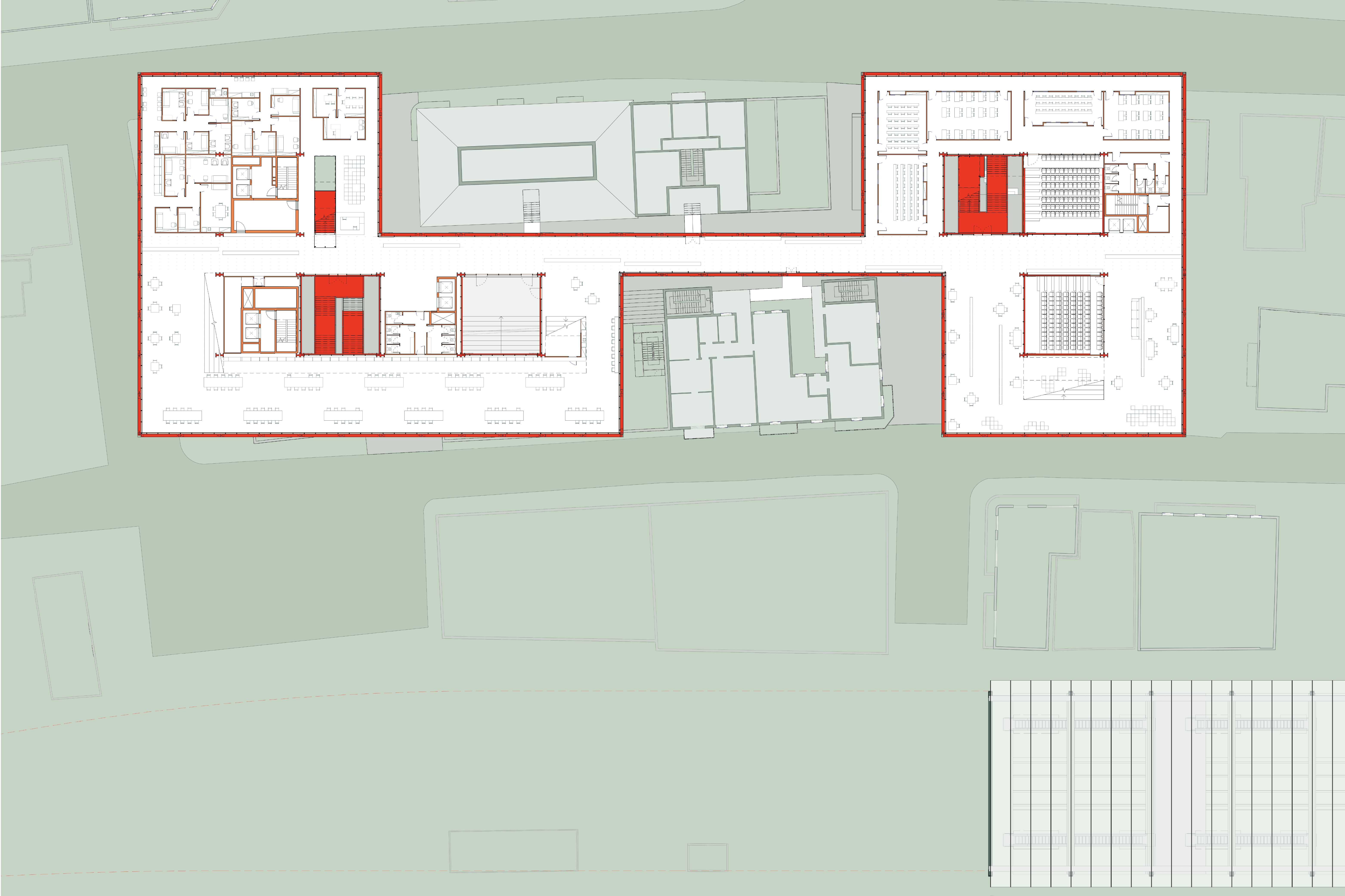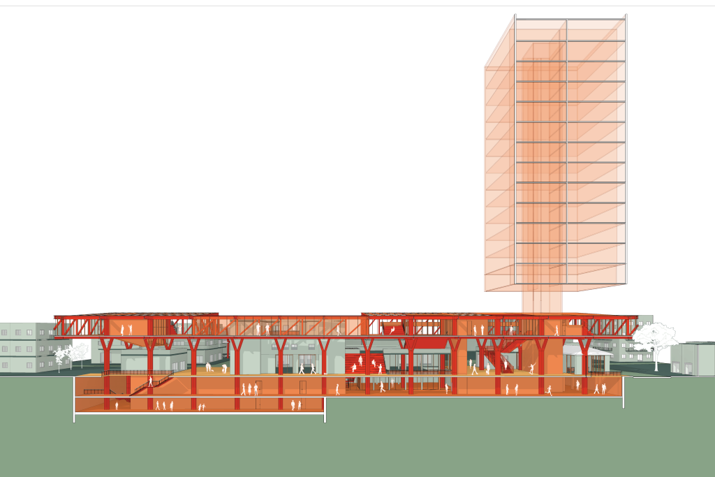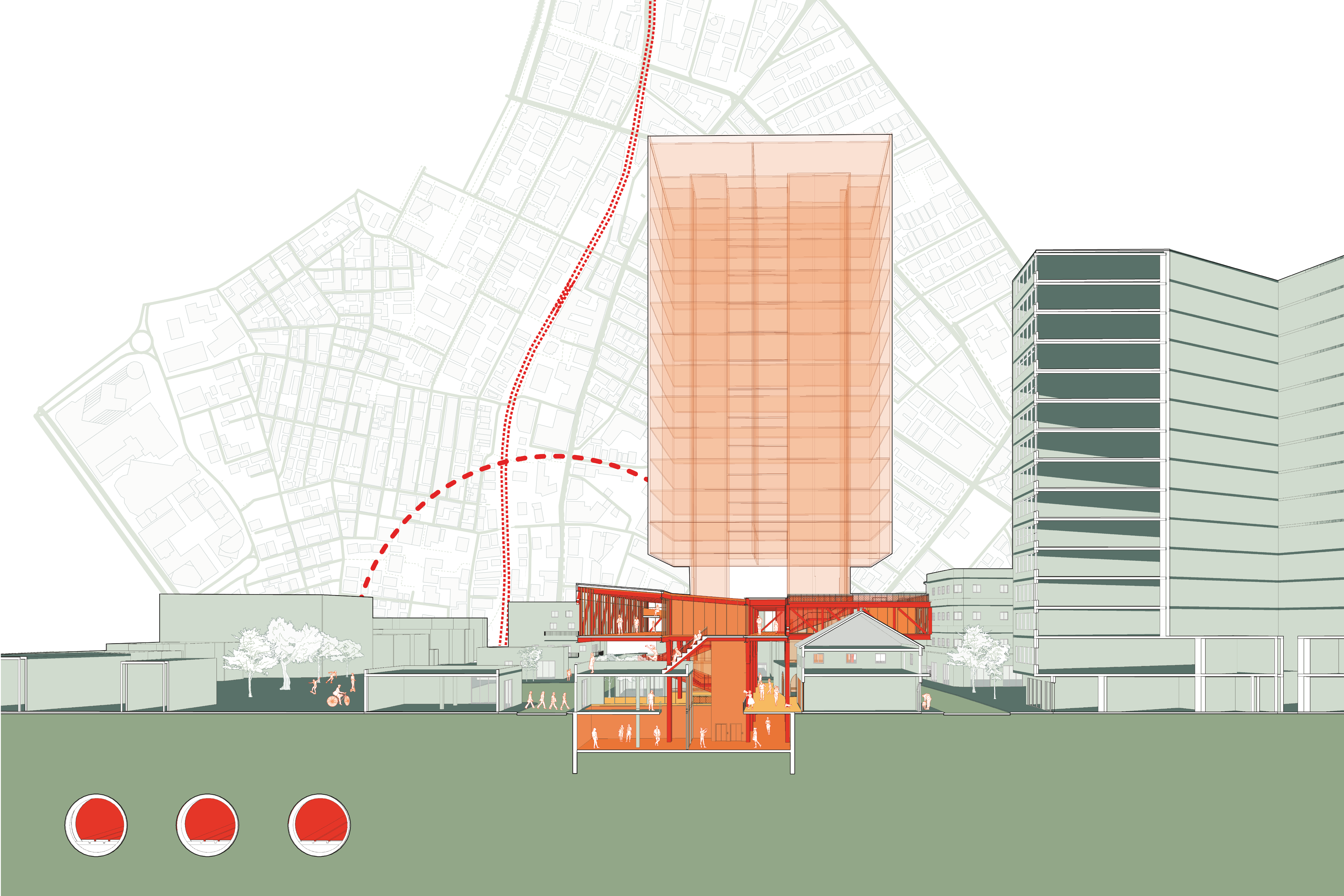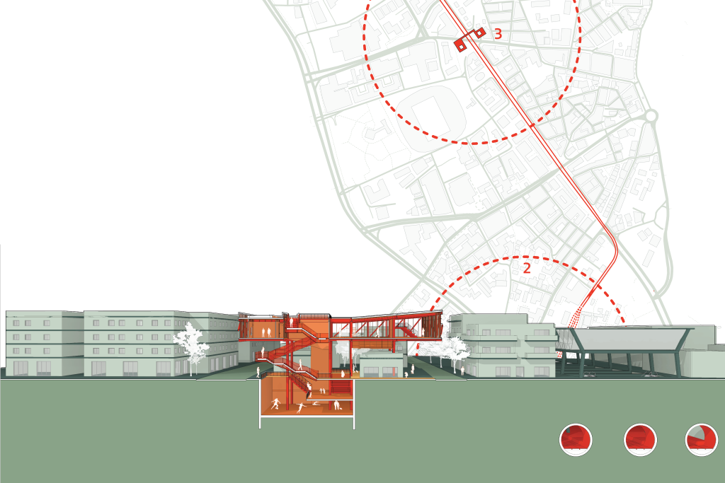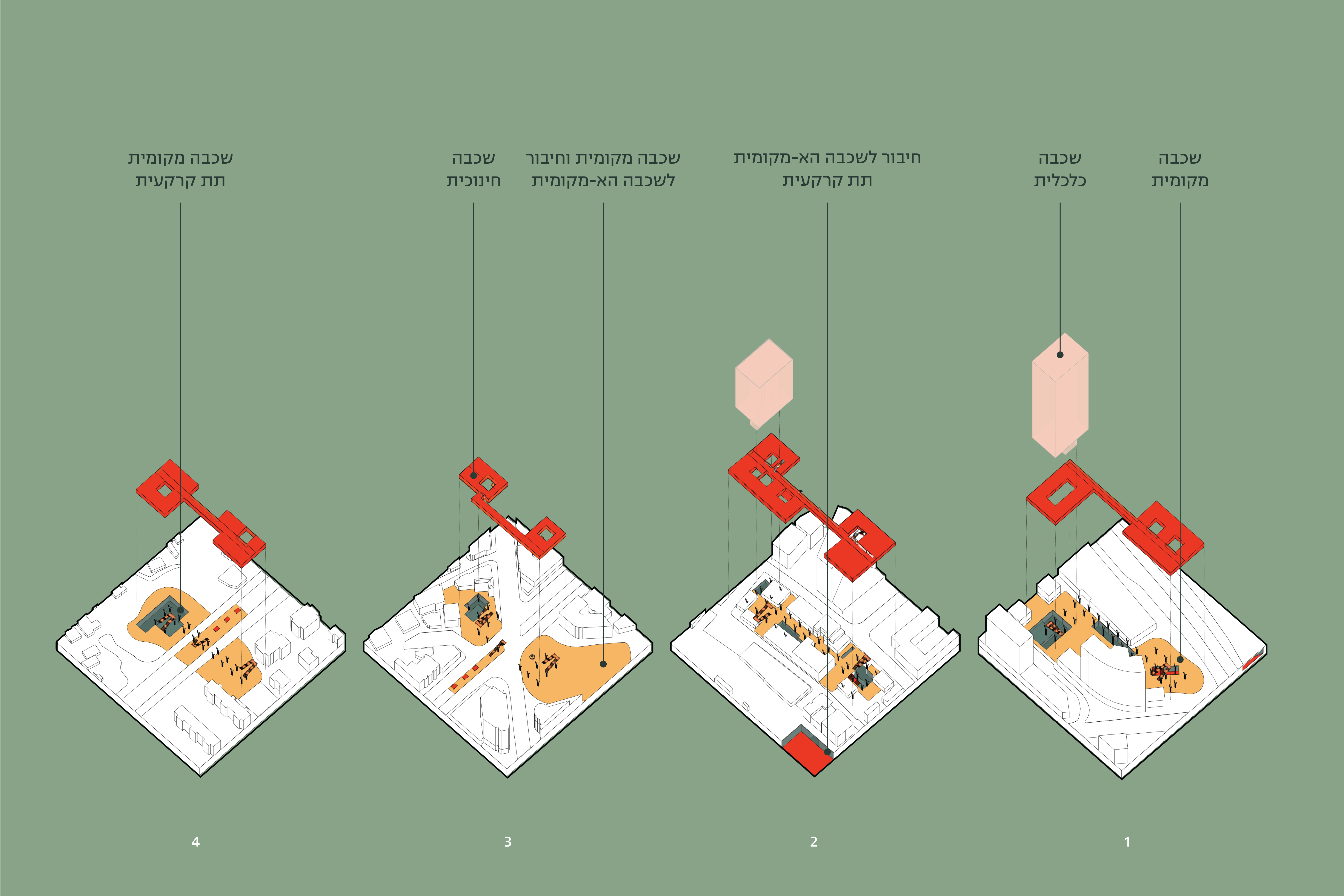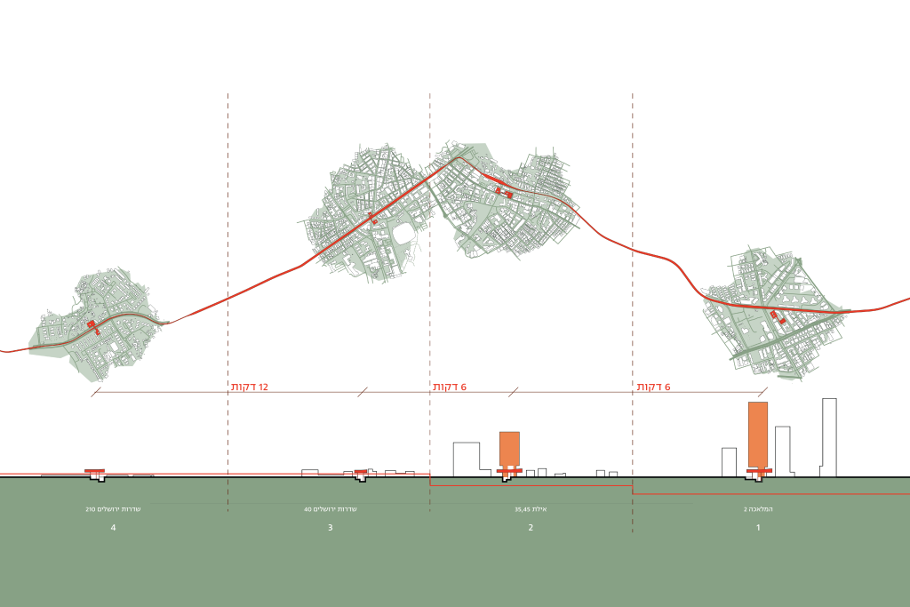 אסטרטגיית ההתערבות מציעה רשת מבוזרת של מוקדים ציבוריים, המחוברים באמצעות הרכבת כ“מעלית אופקית”. הרשת מורכבת באופן רב שכבתי: מפלס קרקע ציבורי, תת קרקע המוסב למרחבים שכונתיים, קומות חינוכיות-ציבוריות המרחפות מעל, ושכבה כלכלית המבטיחה ישימות. הקו האדום ותחנת אליפלט נבחנו כמקרה מפורט המדגים כיצד מגרשים תפעוליים לשעבר יכולים להפוך למוקד עירוני פעיל, המחבר בין המקומי לבין הא-מקומי, ובכך מנסחים אפשרות חדשה לחיים קהילתיים בלב העיר.