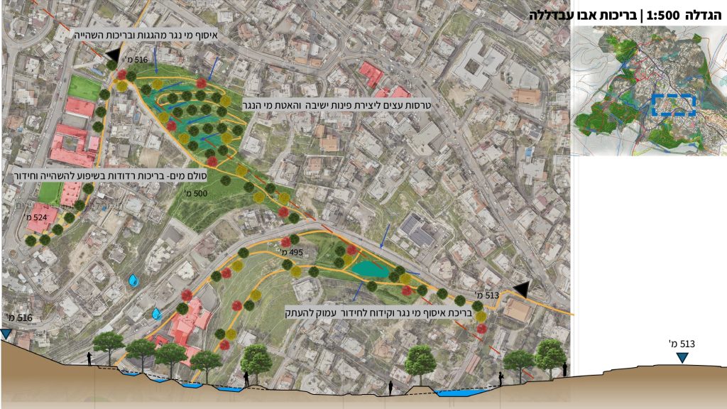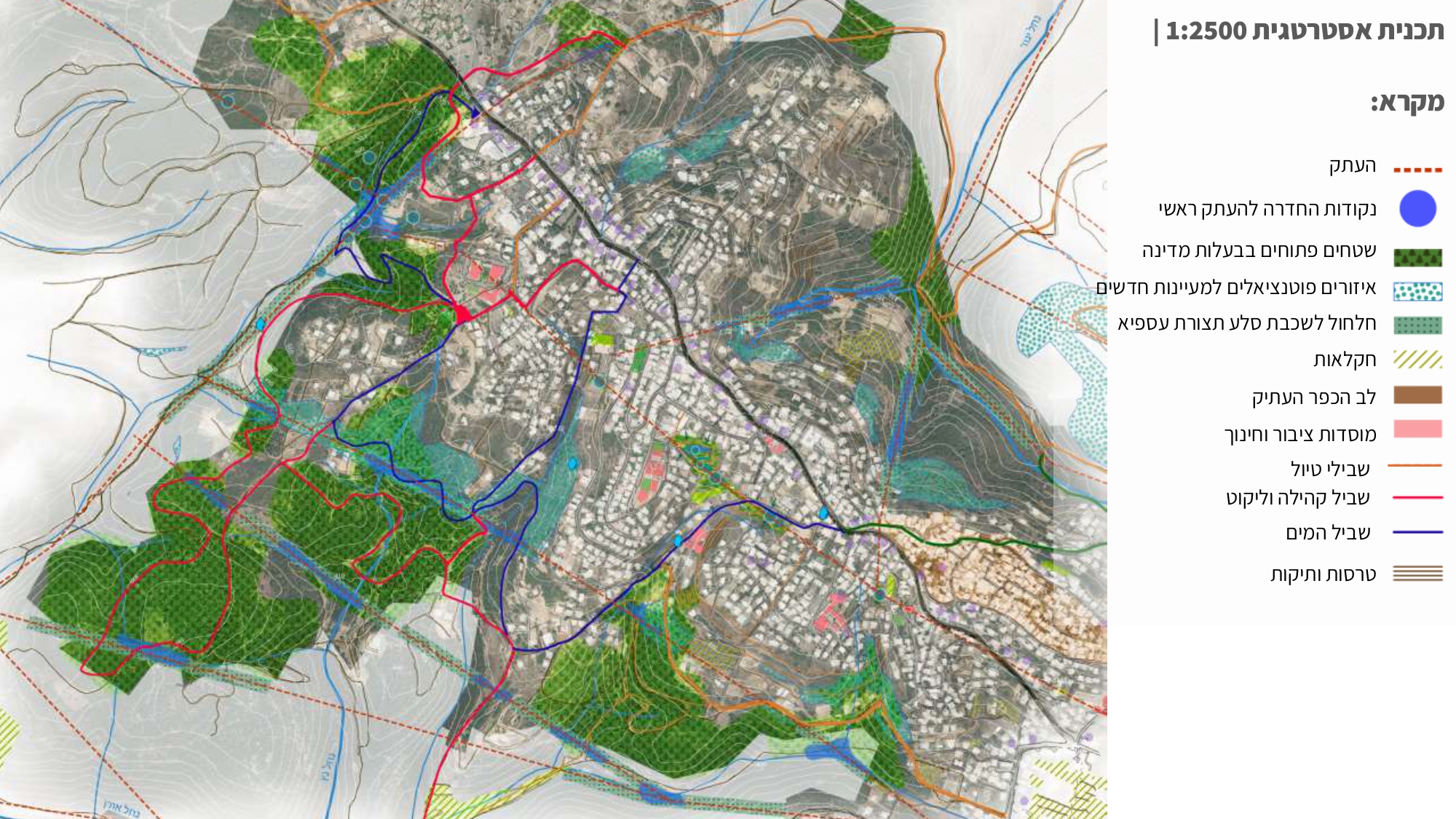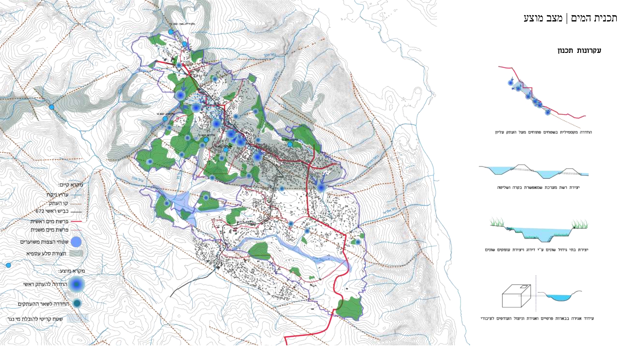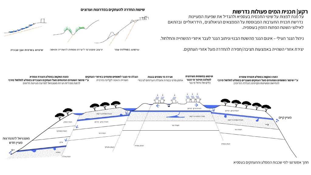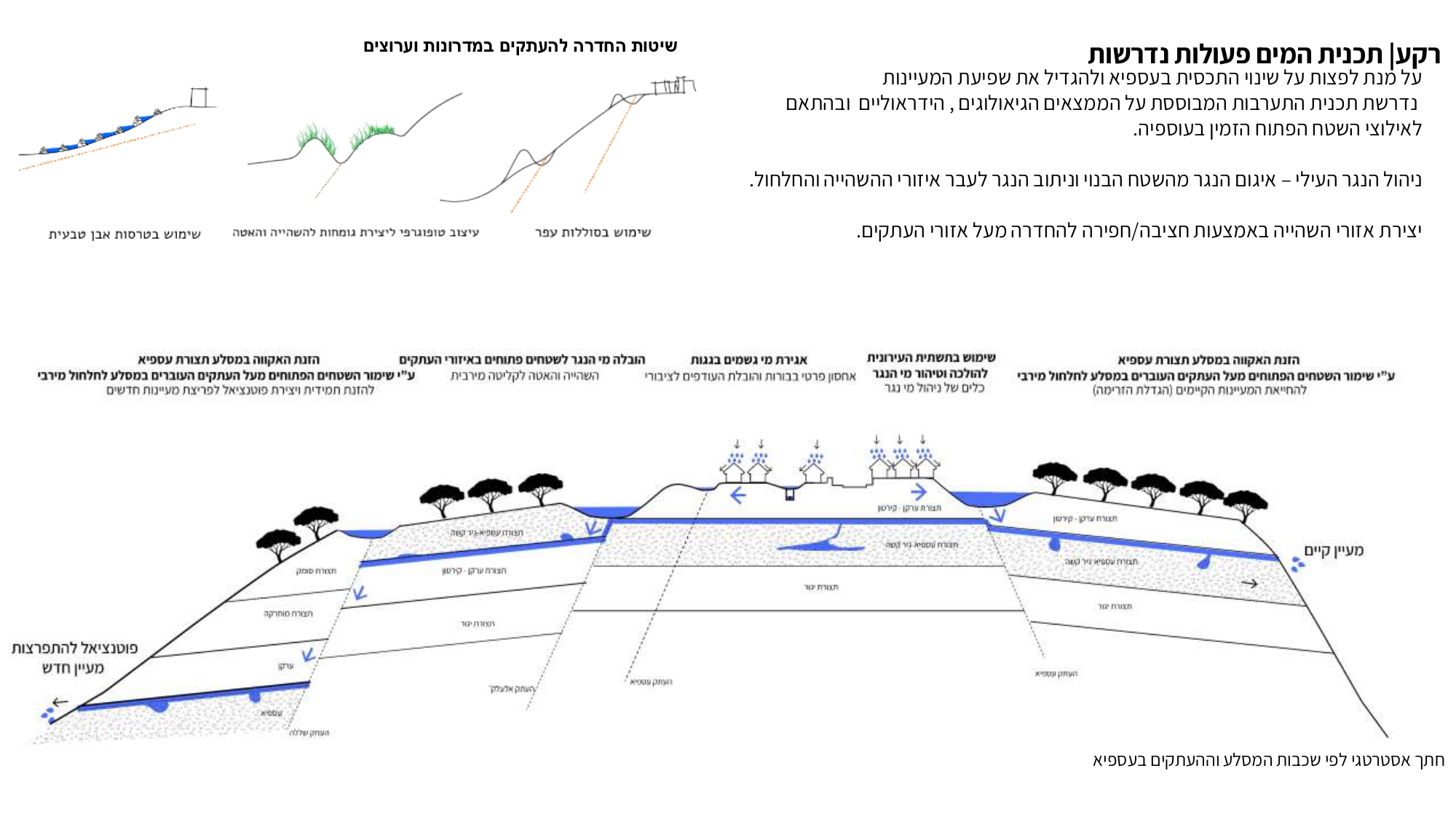 מן המנגנון ההידרו גיאולוגי נגזרת תשתית תכנונית־אסטרטגית: מערכת נופית־ציבורית של שבילים, מוקדי שהייה ושימור נופי מורשת כגון טרסות ותיקות, שבה המים פועלים ככוח מארגן של הנוף והקהילה. הפרויקט מציע שיקום נופי־הידרולוגי, המשלב ידע בין־דורי עם פתרונות עכשוויים, ומעניק לעספיא בסיס מחודש לחוסן קהילתי־כלכלי ולזהות מקומית. בכך הוא מציב מודל ייחודי של קיימות מבוססת־מקום, שבו המים חוזרים להיות לא רק משאב אלא גם בסיס של חיים, שייכות וקהילה – וחזון לעתיד בר־קיימא, שבו עספיא שומרת על ייחודה ונשענת מחדש על הקשר שבין אדם, מים ואדמה.